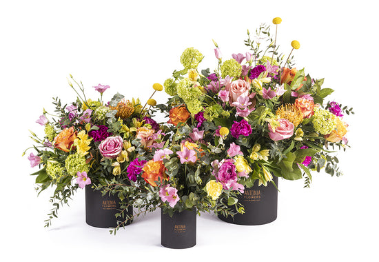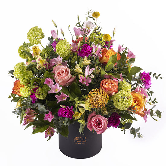 Un’esplosione di colori e profumi racchiusa in una box elegante firmata Antonia Flowers Roma. Fiori vivaci in tonalità arancio, rosa, lime, giallo e fucsia si mescolano in una composizione ricca, fresca e piena di energia. Amalfi Box è perfetta per chi ama i contrasti, la luce e il carattere mediterraneo: un bouquet che sa di sole, estate e buon umore.
