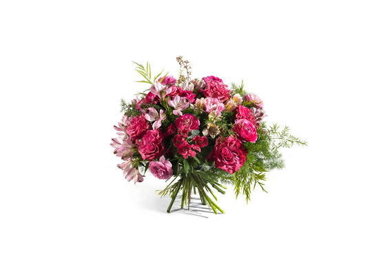 Un bouquet pieno di carattere, con rose e fiori dalle sfumature rosa intense e fucsia, mescolati a tocchi verdi leggeri e ariosi. La composizione è elegante ma spontanea, pensata per chi ama il colore e i contrasti decisi. Perfetta per un regalo che non passa inosservato.