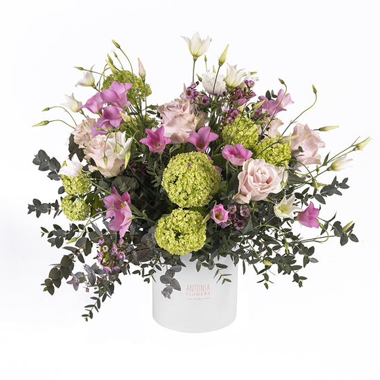 Ponza Box è una composizione di fiori freschi dai toni pastello, con tocchi di verde e rosa cipria ariosa, elegante e raffinata.